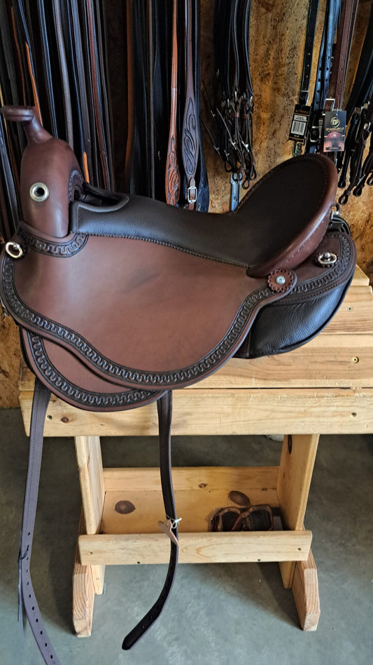 Innovative design brings western saddles to a whole new level of comfort and convenience. This saddle can come with a horn (Model 1216) or without a horn (Model 1214). Other upgrades include Soft leg area (SKL) or the Western Skirt. Keep the same fantastic saddle for your horse's back and the same seat comfort for you. But Add a little more western flair with a Cheyenne roll cantle, longer rear skirting, and a western cinch adapter from the billets. Read More HERE