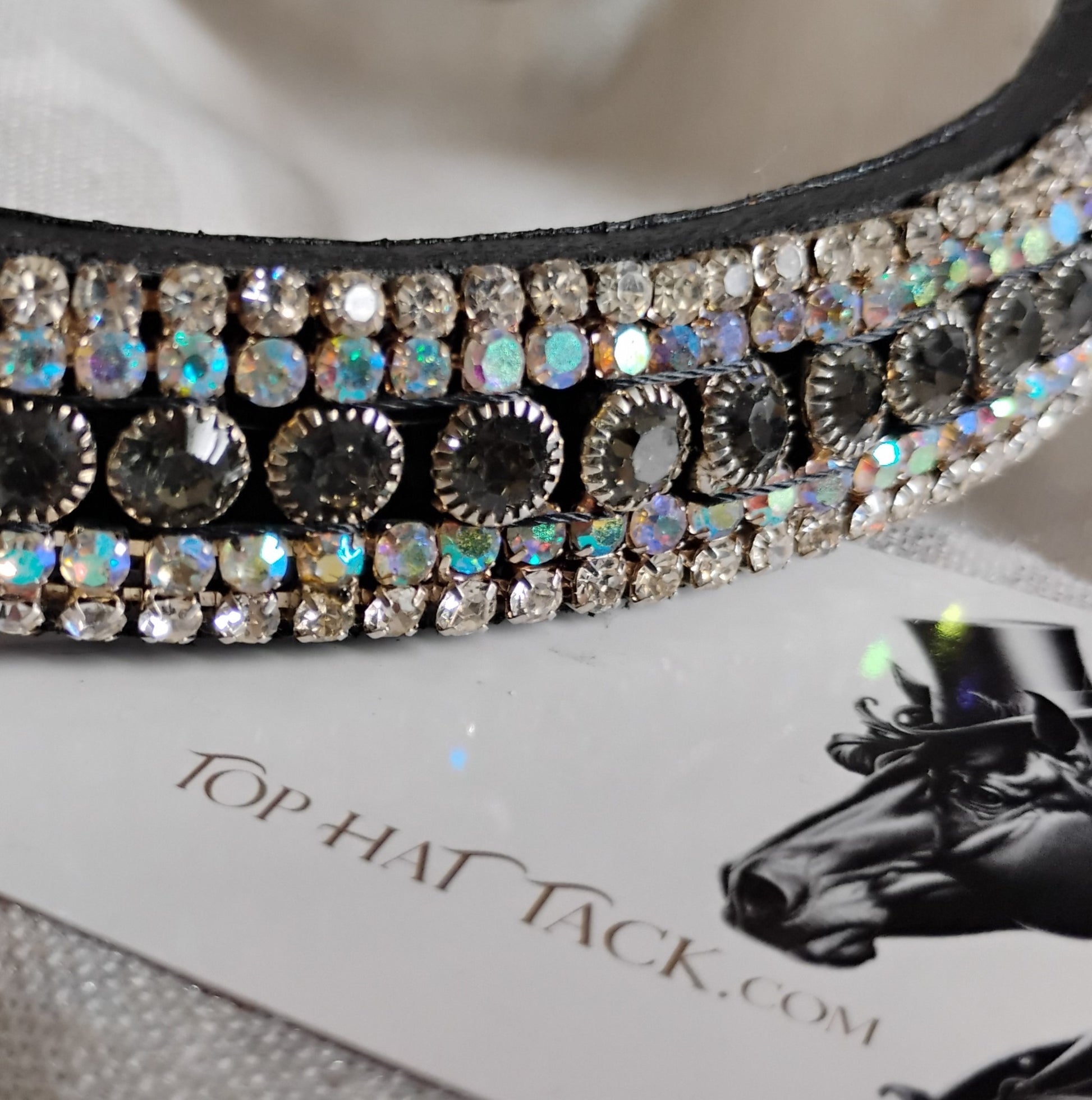 Eye catching extra large grey center crystals surrounded by aurora and clear crystals. On black leather