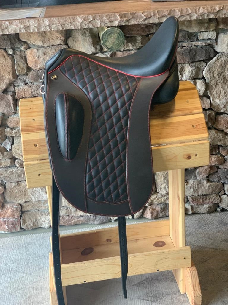 The Bolero 3220 Dressage and 3110 Working Equitation versions (XT & DL). The panels are designed to be light around the scapula. The stylish squared flap has a soft leg area (SKL) that is quilted. The leg block is fixed and up out of the way of the knee.