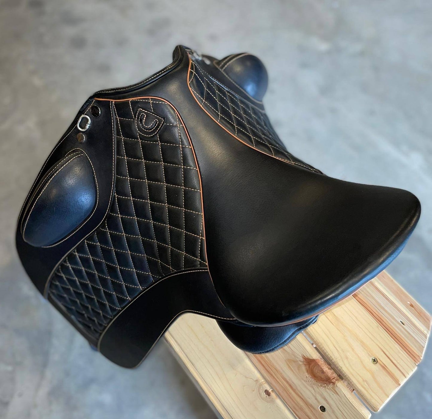 The Bolero 3220 Dressage and 3110 Working Equitation versions (XT & DL). The panels are designed to be light around the scapula. The stylish squared flap has a soft leg area (SKL) that is quilted. The leg block is fixed and up out of the way of the knee.