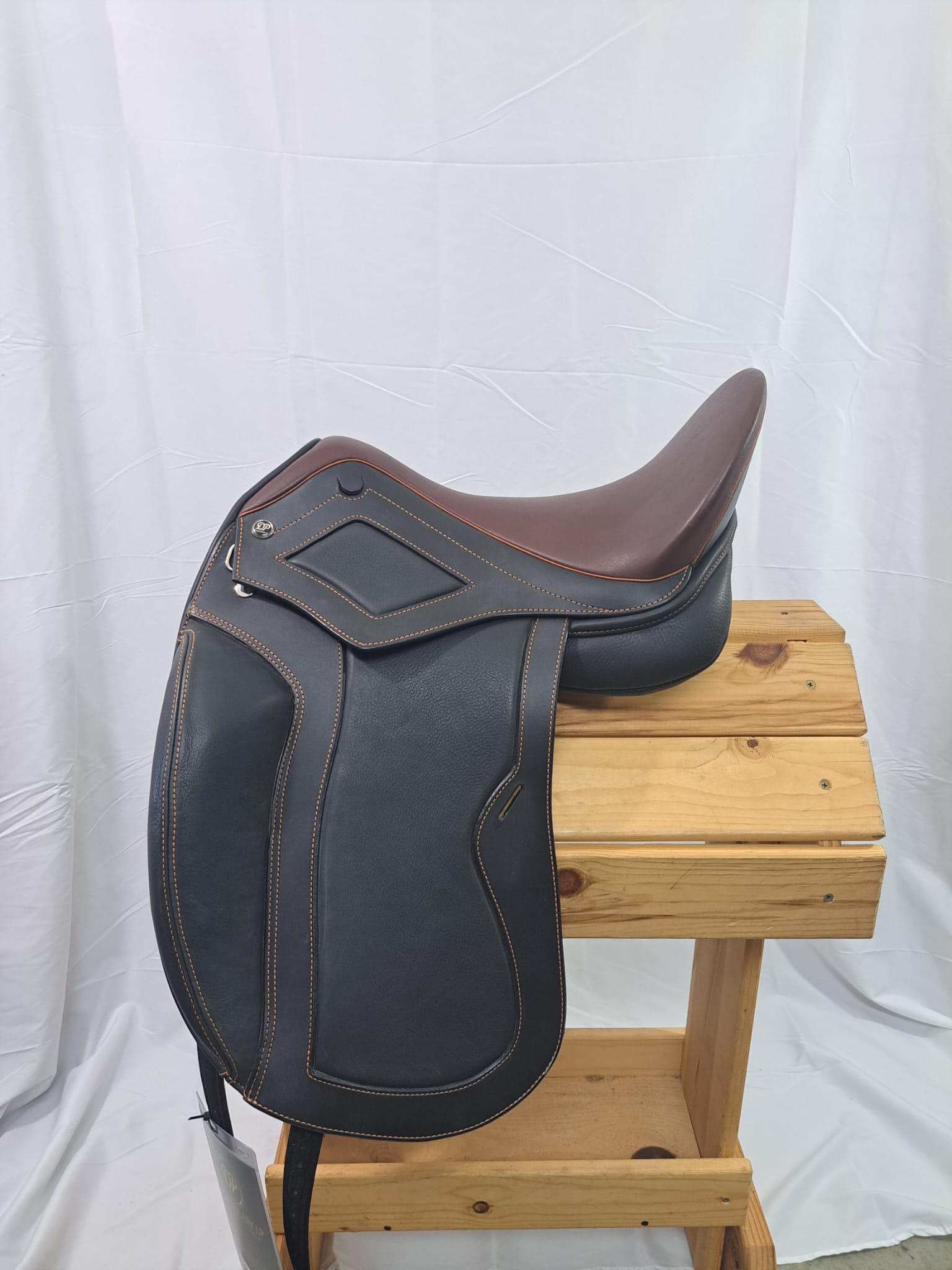 The Duett DL 3310 is a monoflap saddle with doubled soft nappa leather leg area skirted in saddle leather. The leg blocks on the Duett are longer fixed external blocks.