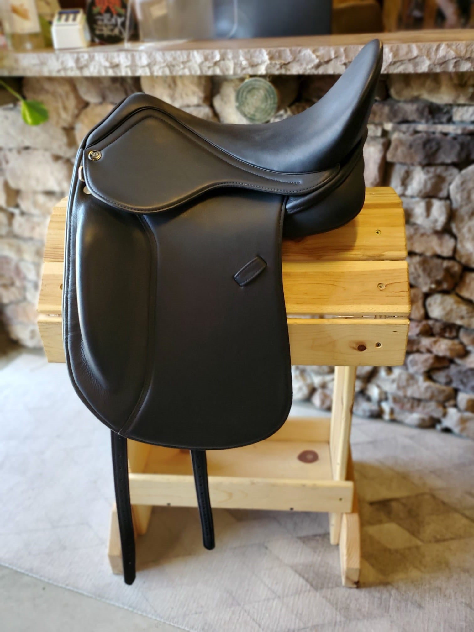 The Libra 3320 comes in a monoflap. The leg blocks are fixed in a higher forward position with a more gradual slope.  The whole saddle is doubled soft nappa leather over the whole saddle for a soft close contact feel.