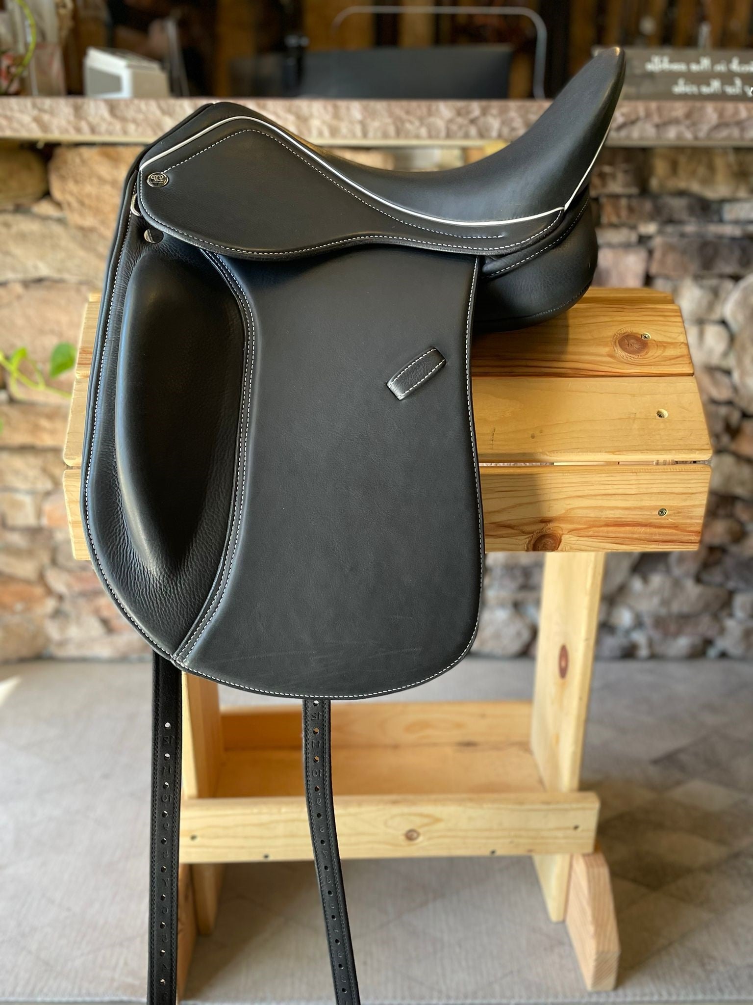 The Libra 3320 comes in a monoflap. The leg blocks are fixed in a higher forward position with a more gradual slope.  The whole saddle is doubled soft nappa leather over the whole saddle for a soft close contact feel.