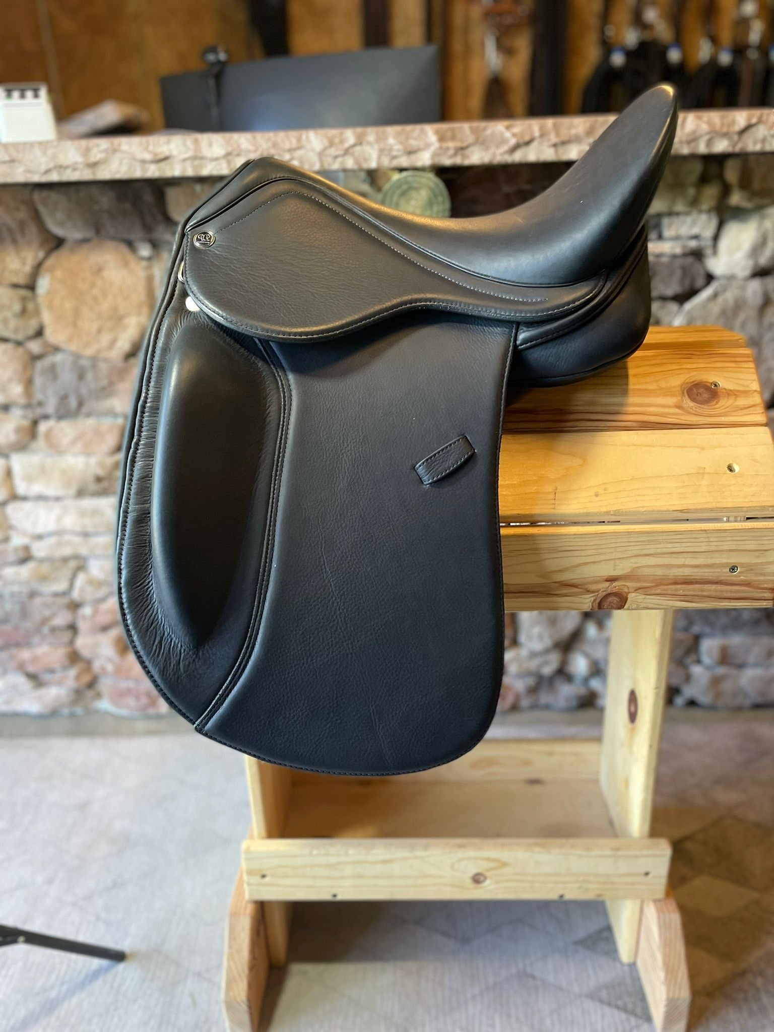 The Libra 3320 comes in a monoflap. The leg blocks are fixed in a higher forward position with a more gradual slope.  The whole saddle is doubled soft nappa leather over the whole saddle for a soft close contact feel.