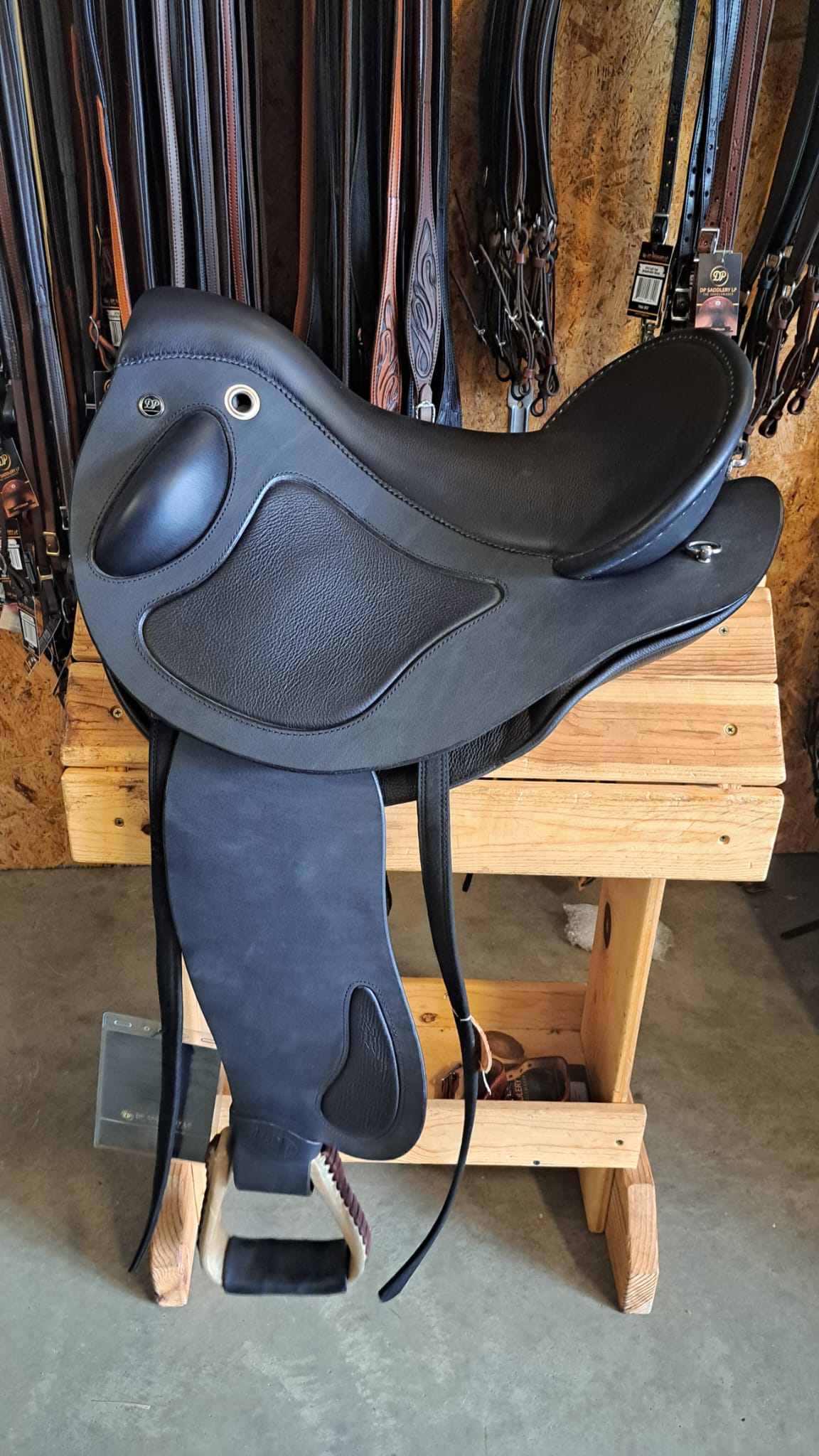 The  broad sit bones makes it comfortable for long rides. Narrower twist that is not going to ride up on you. Similar seat to the El campo (dressage/English style flap) but add on the Fenders, and thigh blocks. The blocks are not there to interfere with your motion just there if you need them. The soft leg area on the skirt under the leg helps keep a close contact feel while minimizing the time it takes to break in the saddle. Soft areas can be filled in with any of the Nubuck or Nappa colors that DP has available. Express yourself with color or stay simple. We can get you set up with your dream DP saddle! If we don't have the size or color you need we can build it for you.