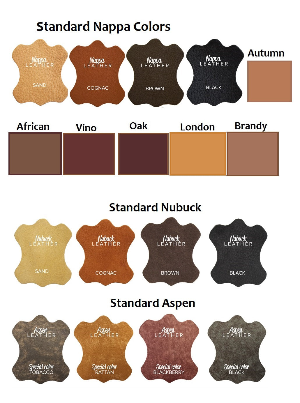 - Nappa colors: sand, cognac, brown, black, vino, african brown, london, brandy, autumn, oak.