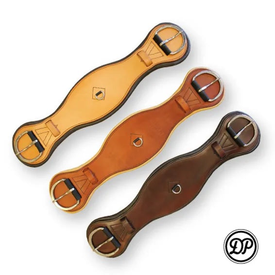 The DP Saddlery girth is designed for horse comfort. It has 1 buckles on either side. Contour shape for elbow relief and broad contact to the sternum. There is no elastic in these girths because they are used with the DP flex trees. Flex + Elastic may have too much give. Building the girth takes about 3 months, Some items are ready to ship.