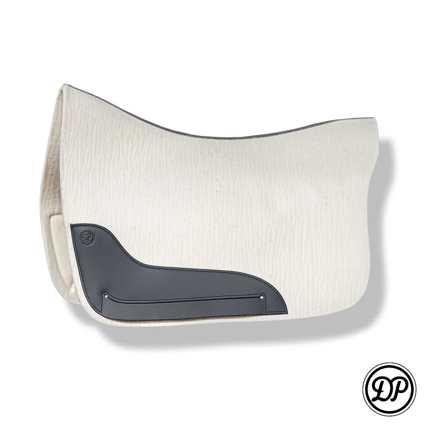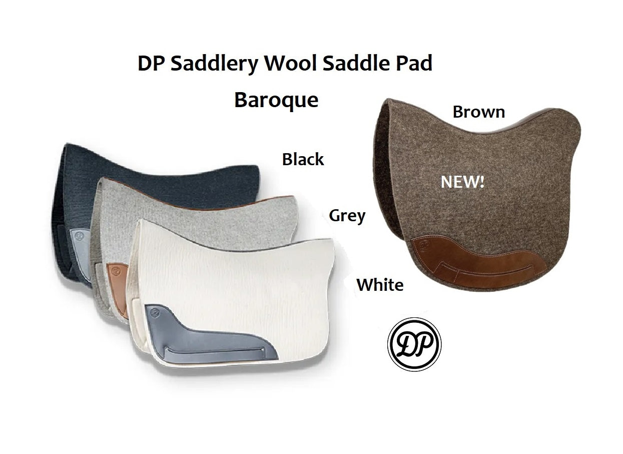 The DP Saddlery real wool saddle pad is designed specifically for the DP Baroque saddle line. Natural wool breaths and wicks sweat better for the horse. The pads are about 1/3 inch thick but can vary because of the natural product material. Some items are ready to ship, others can be custom ordered to match your saddle. Custom orders take about 3 months to make.