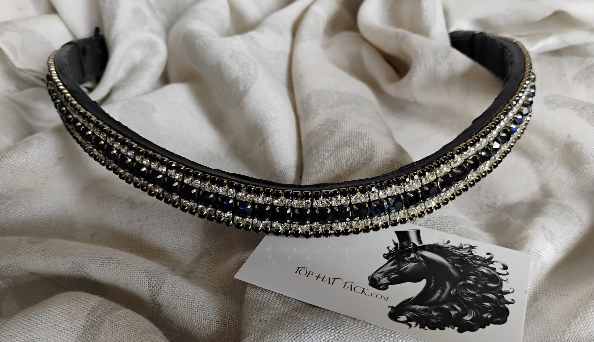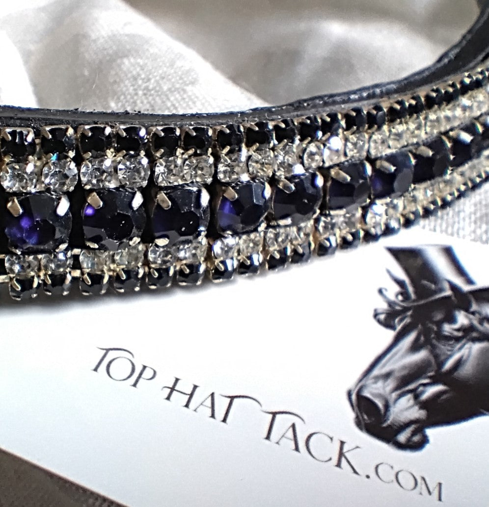Eye catching Navy blue and clear crystal browband with large center crystals. On black leather