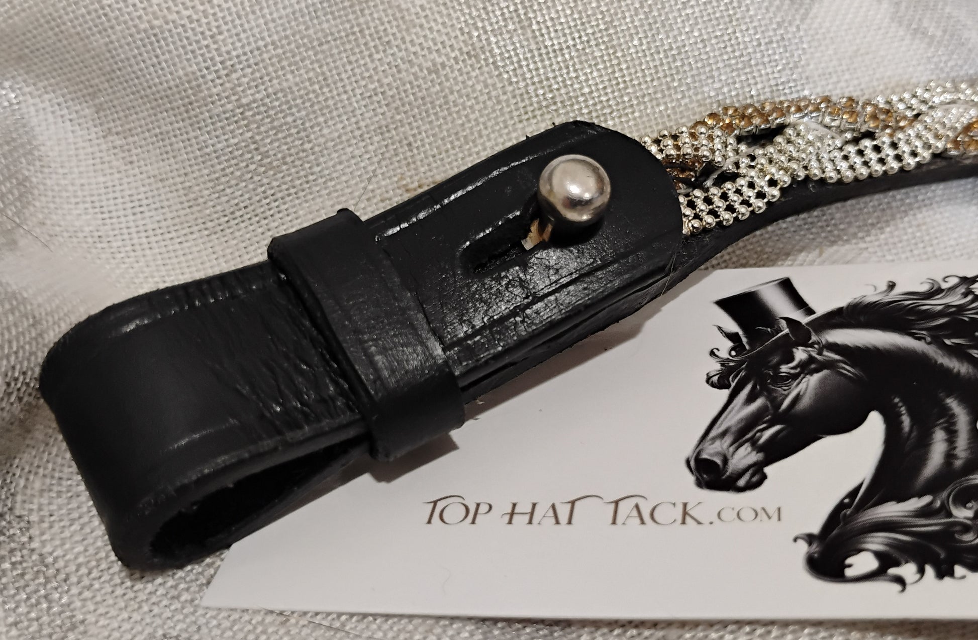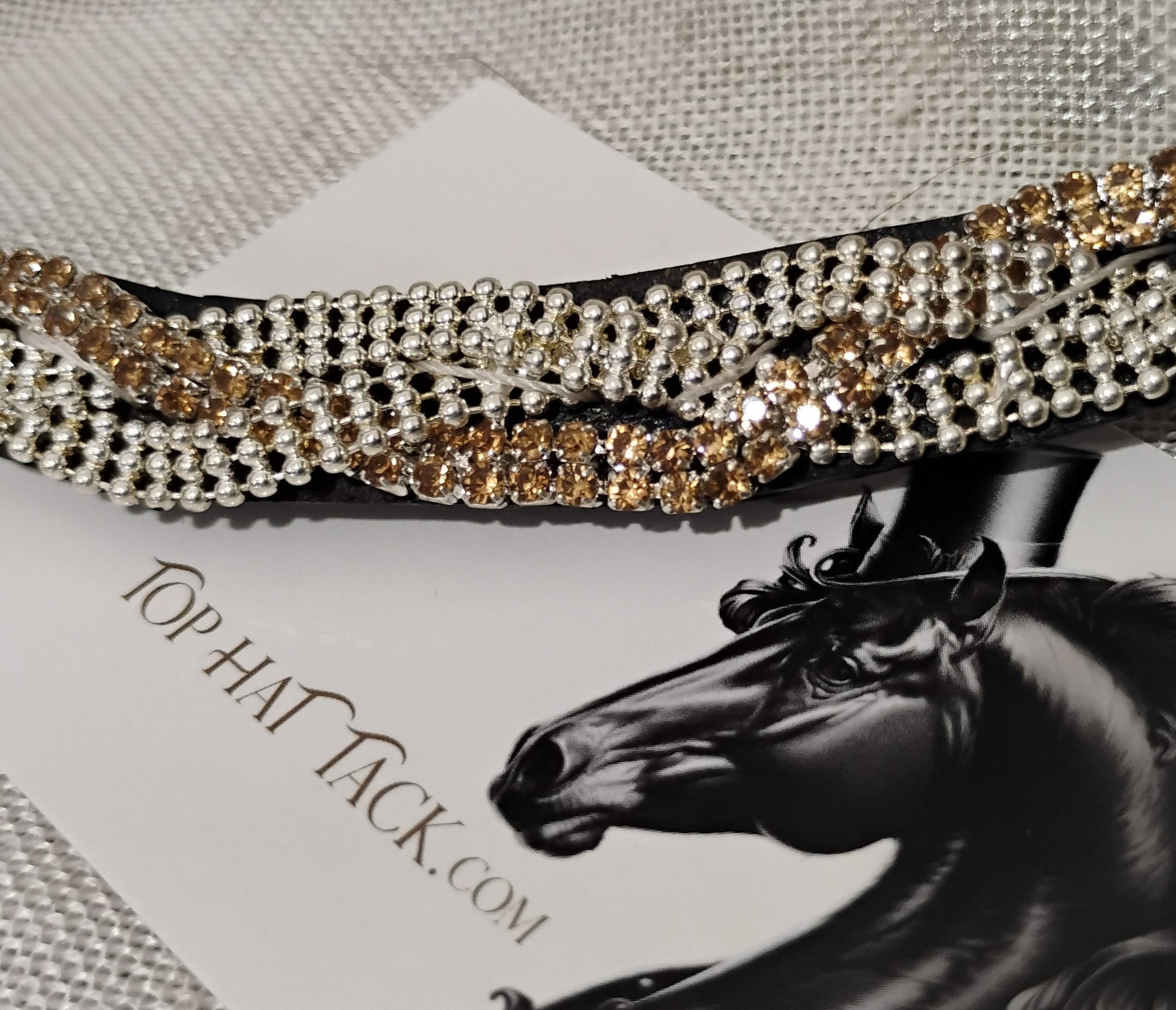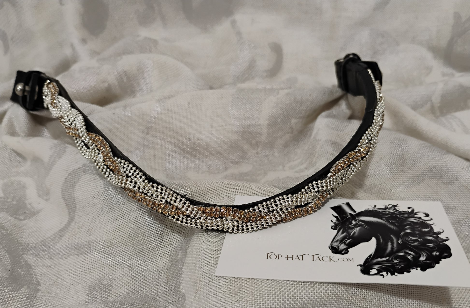 Eye catching champagne and clear braided browband. Sides are button toggle for easy removal without taking your bridle apart.