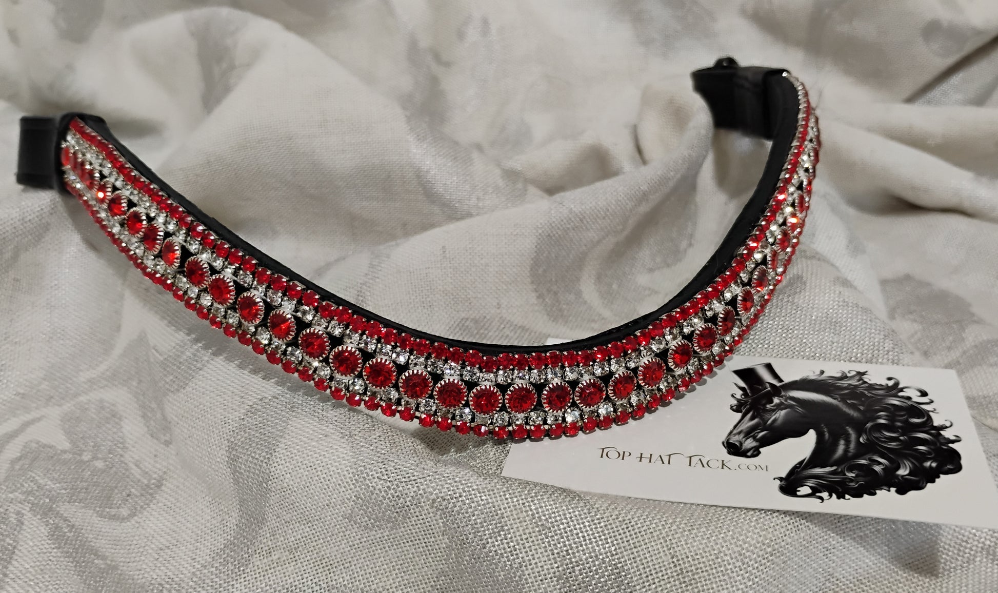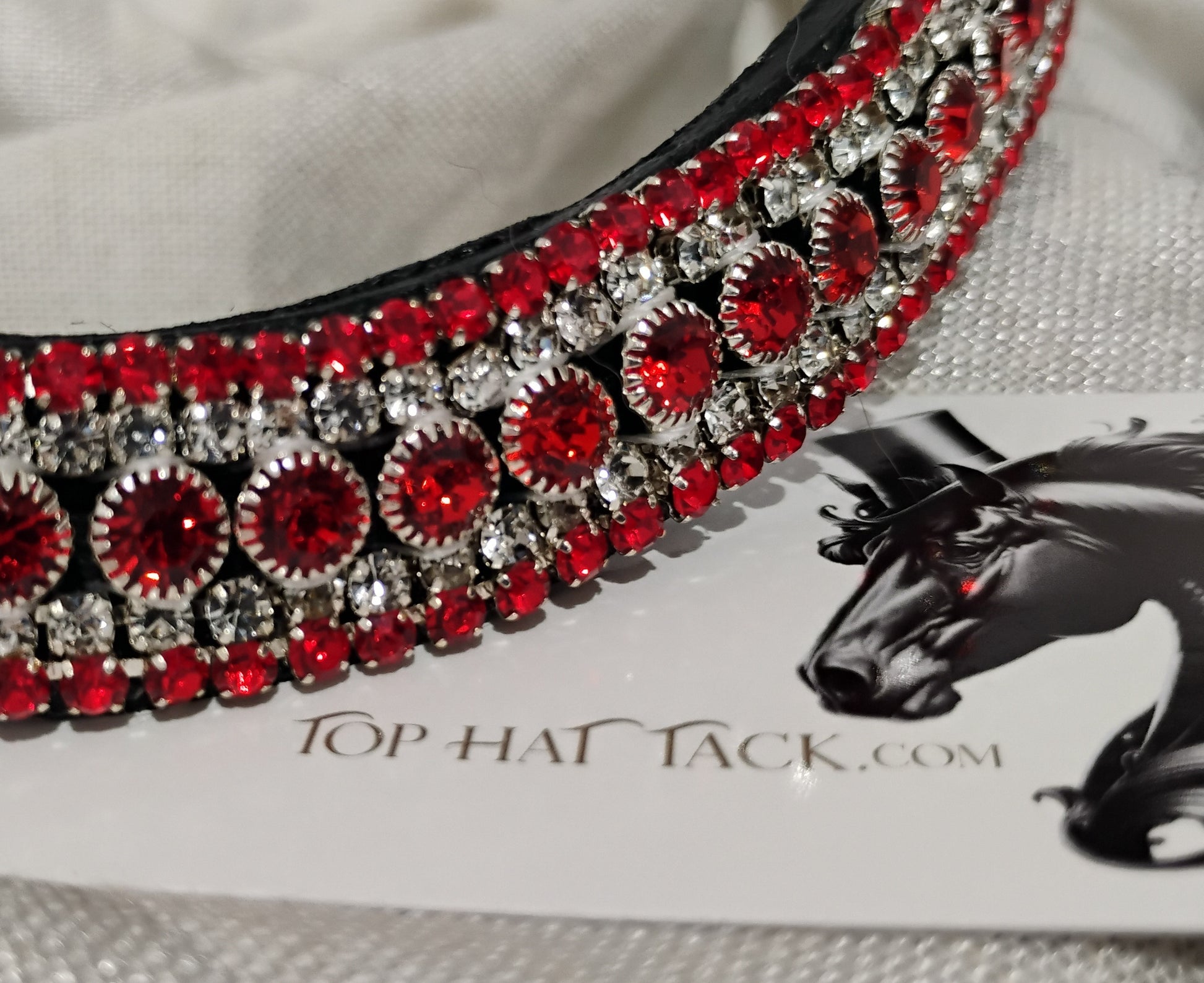 Eye catching red and clear browband with large round center stones is sure to look good on your horse.