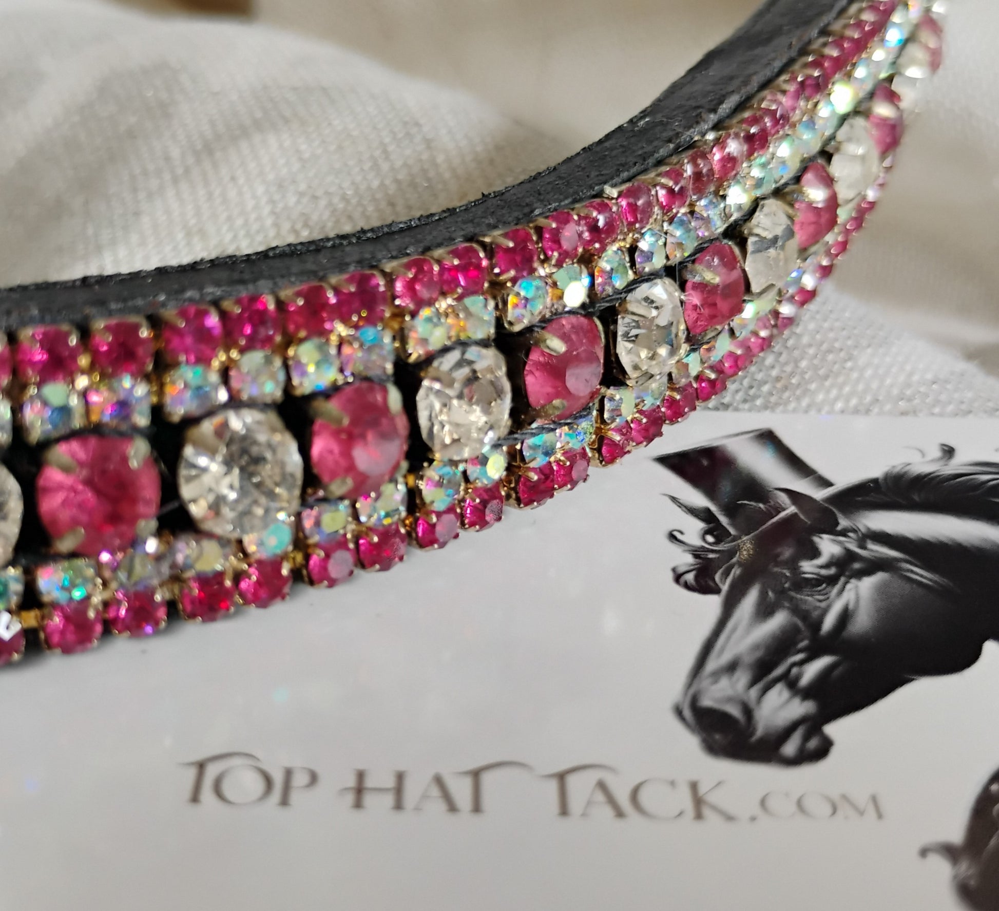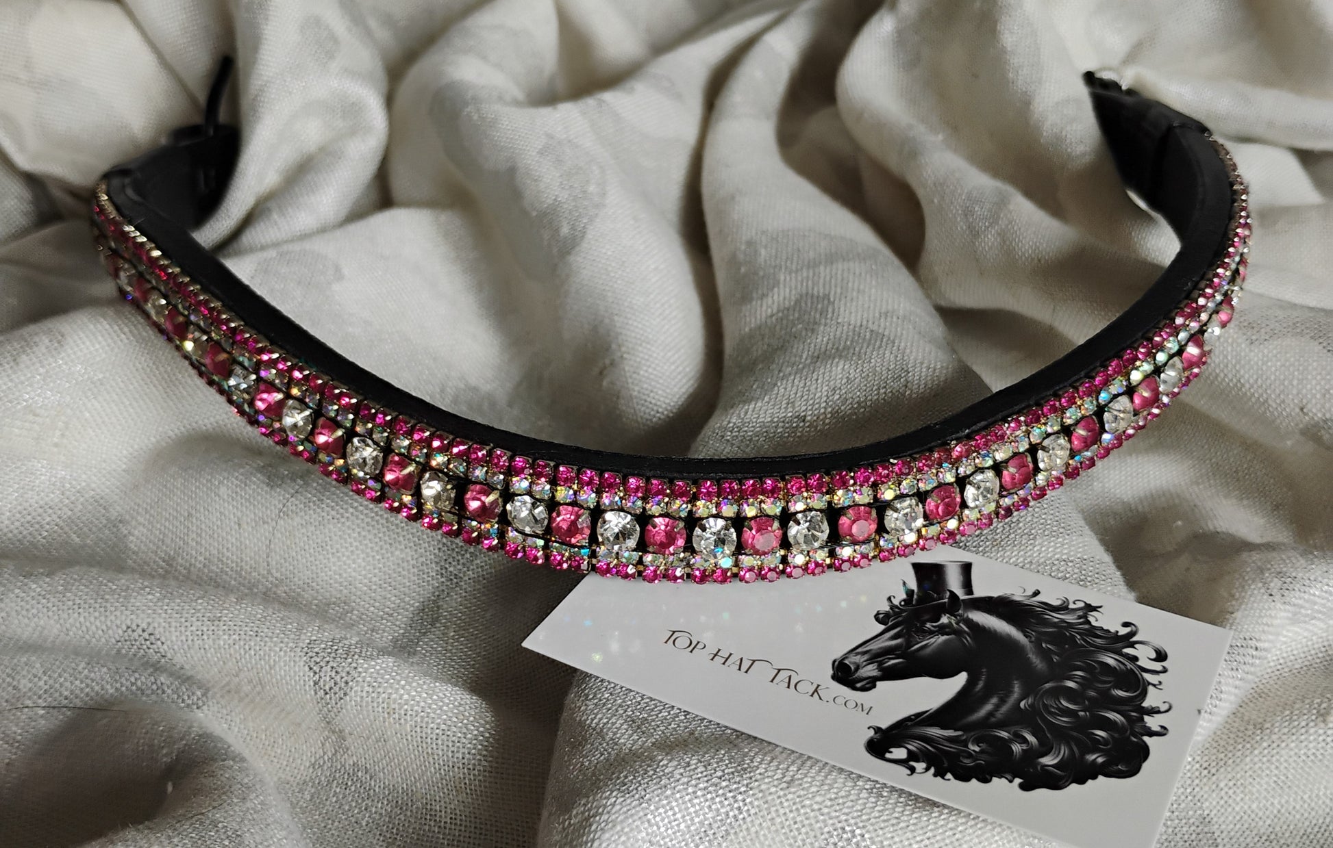 Eye catching Pink and Aurora crystal browband. The center row of crystals alternates pink and white larger crystals. On black leather.