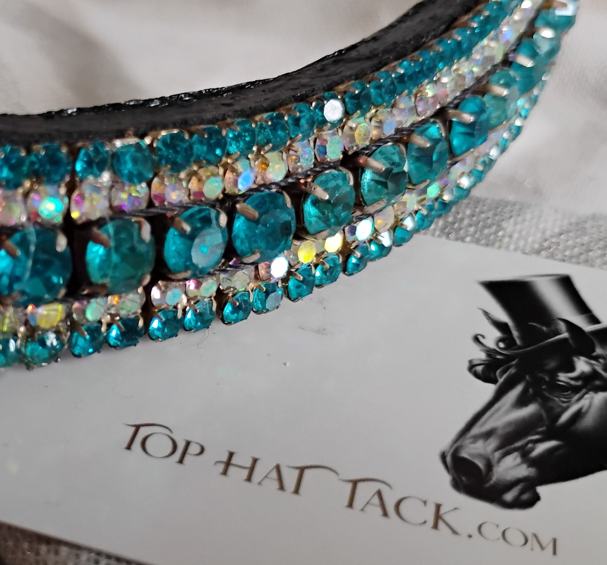 Eye catching Teal/Turquoise and Aurora crystal browband. The center row of crystals alternates pink and white larger crystals. On black leather.